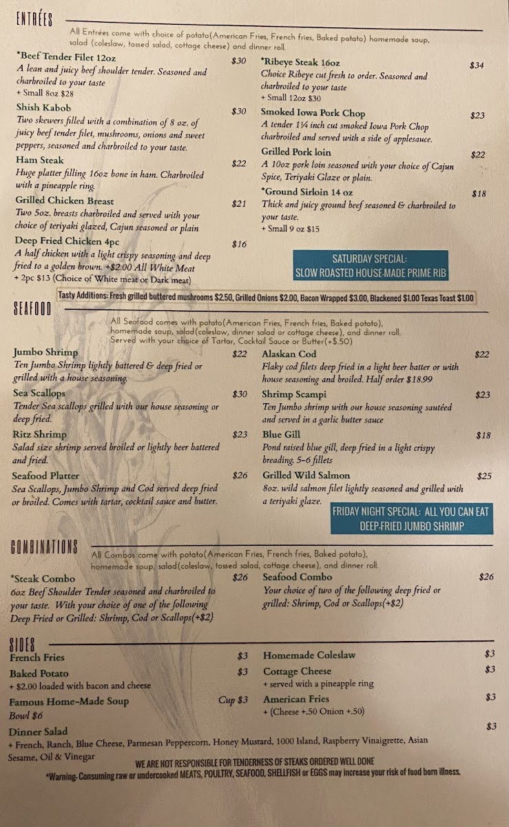 For those who love variety, the Combinations menu allows guests to enjoy the best of both worlds. Options like Shrimp & Scallops, Steak & Shrimp, and Steak & Cod allow for a satisfying mix of flavors, while the Steak & Scallops combo provides a delightful pairing of land and sea.