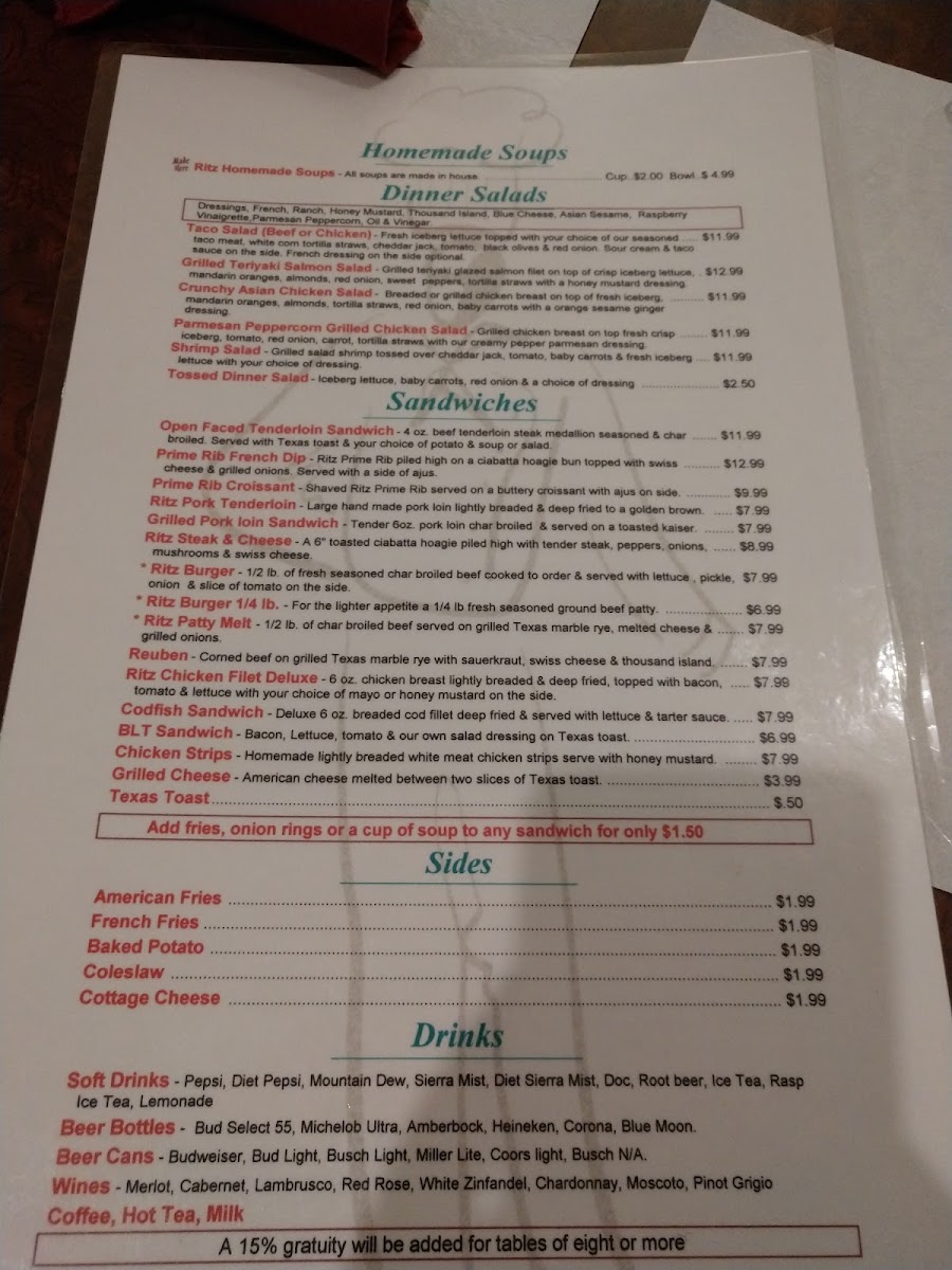 When it comes to the main course, Ritz's Entrées stand out with their range of high-quality meats. The Ritz Prime Rib and Rib-eye Steak are both tender and juicy, making them a favorite for steak lovers. If you prefer something a bit more refined, the Beef Tenderloin Filet or Shish Kabob are excellent options. For a more casual, yet equally flavorful choice, the Ground Sirloin provides a fulfilling, savory experience.